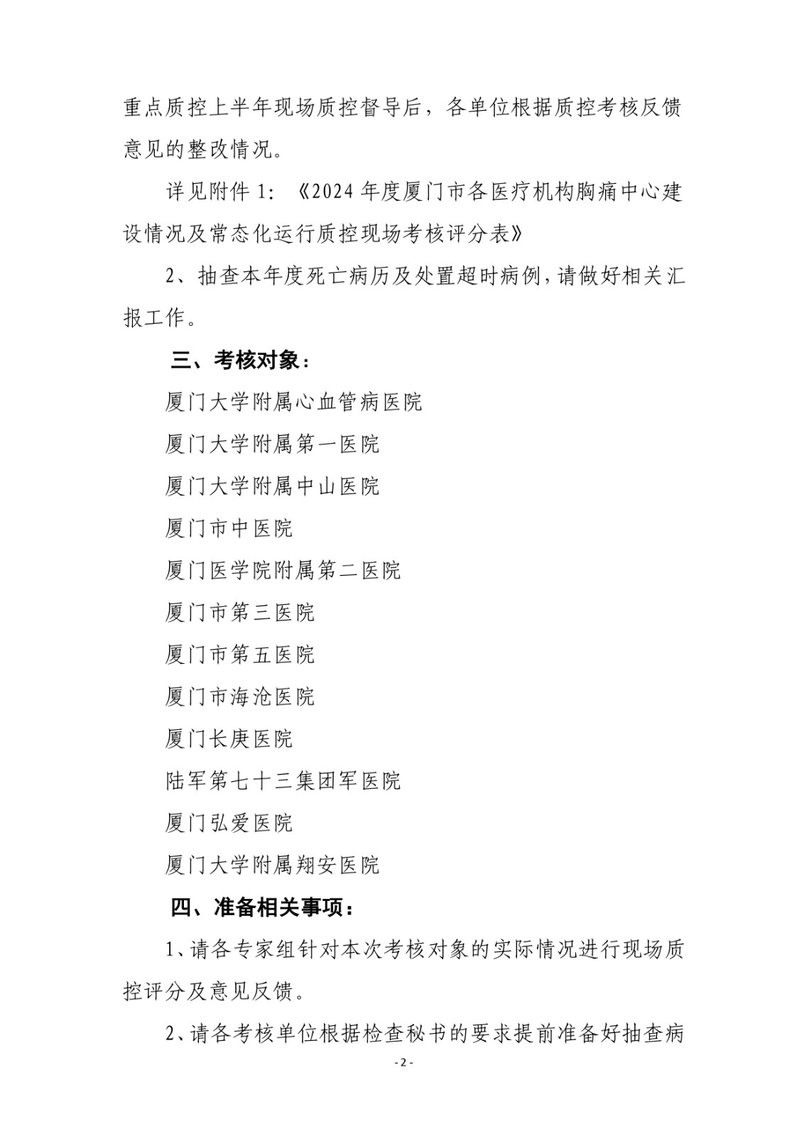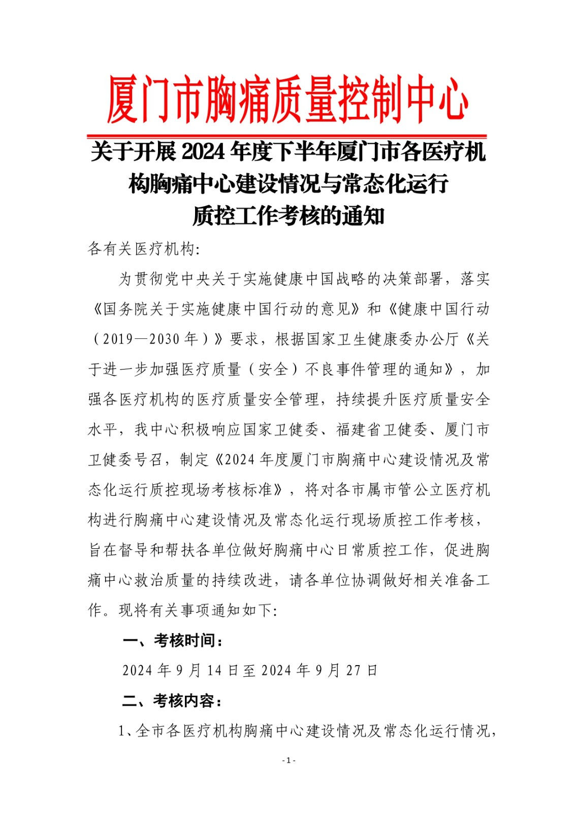 重要通知 | 关于开展2024年度下半年厦门市各医疗机构胸痛中心建设情况与常态化运行质控工作考核的通知